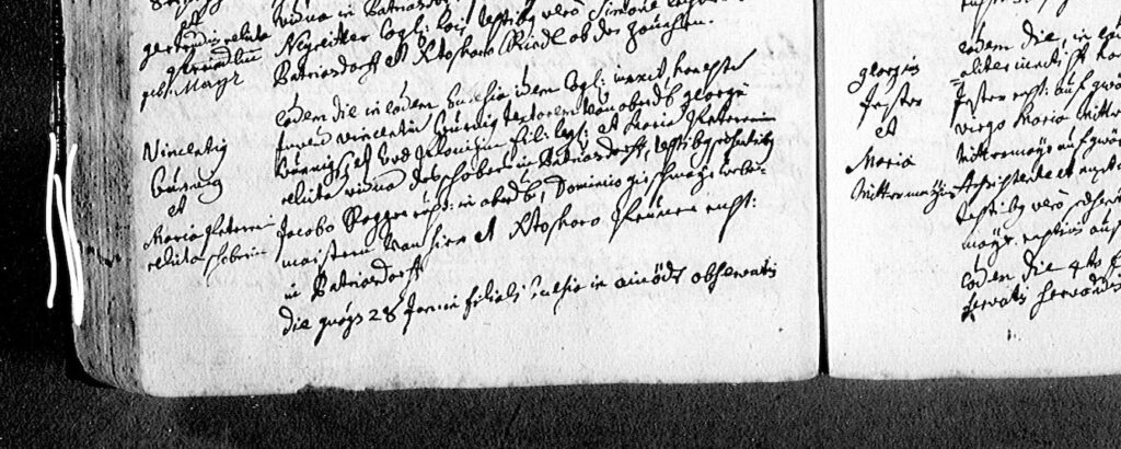 Gregor Wurnig (*1688 in Lienz) und Eva B(P)lauerin / Blux(n)erin / Plonerin (*1679 Tochter von Christian B(P)lauer/Blux(n)er/Ploner und Ursula Veiderin im 45 km entfernten St Veit in Defreggen) waren die vierfachen Urgoßeltern von Ida. Die Braut war bei der Hochzeit in Lienz 30 Jahre alt. Die Namen sind nicht klar lesbar.