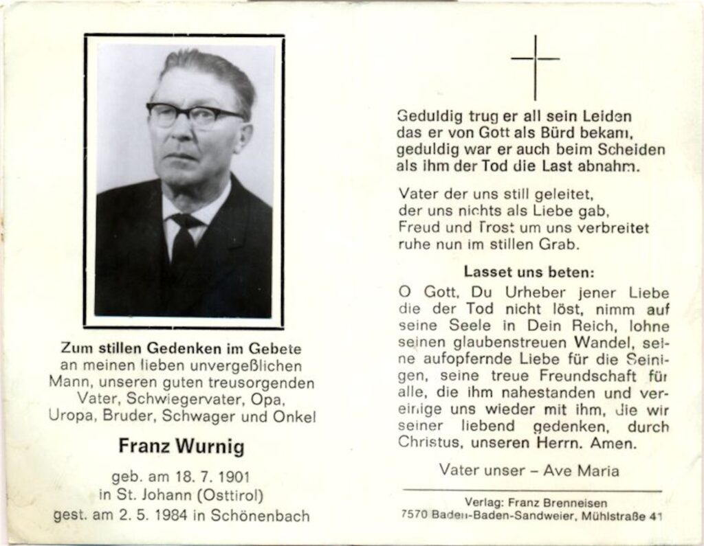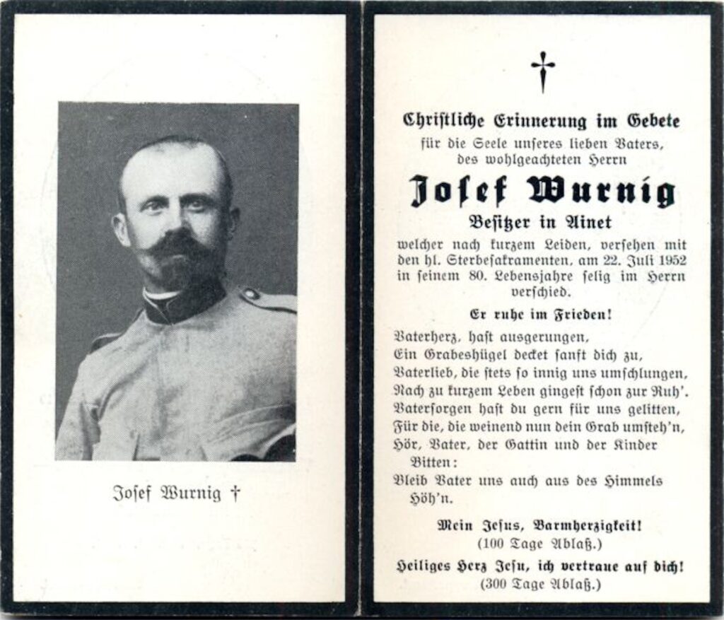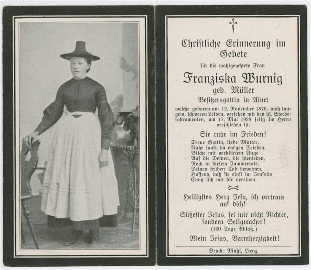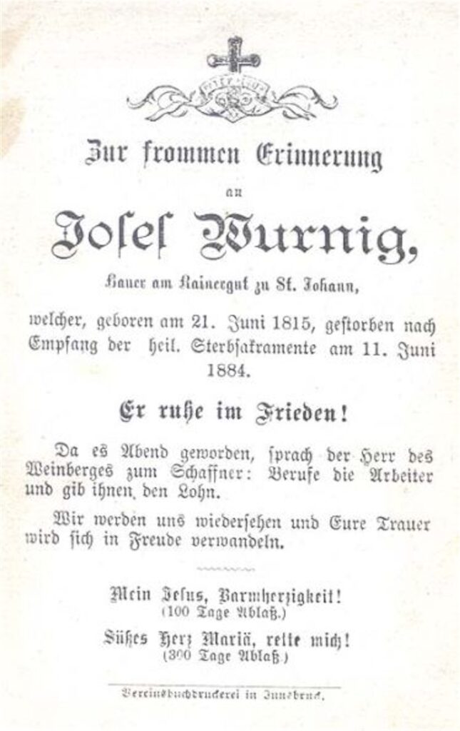 Vater Josef Wurnig (1873-1952) war zu Idas Geburt „Bauer zu Reimer“ in St. Johann im Walde. Die Erklärung zu „Ainet“ am Partezettel findet sich untenstehend.