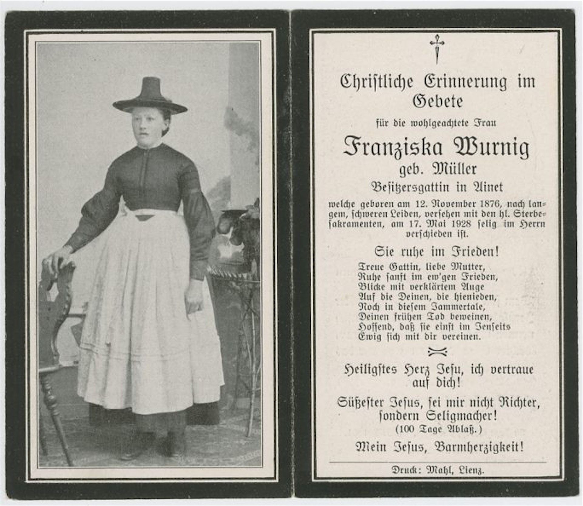 Ihre Mutter Franziska (1876-1928, geb. Müller) stammte von Anton und Maria „Ploier in Grafendorf“ (wohl ein Hausname) ab, ein Dorf bei Lienz.