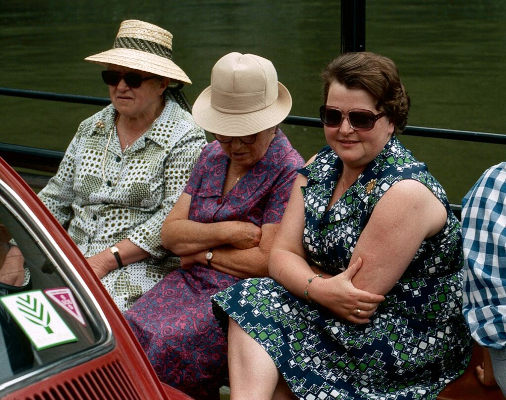 Ich erinnere mich gut an die Erzählungen von Oma über die Bombenangriffe auf Linz, die in der zweiten Kriegshälfte bis in die Mühlviertler Heimat zu hören waren und über ihre großen Sorgen, ob denn Leopold dies unbeschadet überstehen würde. Trotz oder wegen dieser Erinnerungen zog es Ida und ihren Sohn, meinen Vater, immer wieder zu Ausflügen dorthin. So auch 1975 mit Idas Tochter Karoline und der Schwester Maria „Moidl“, die aus Tirol zu Besuch war. Im Bild zu sehe: Gemeinsam auf einer Überfahrt mit der Fähre Obermühl, unweit des ehemaligen Wohnortes.