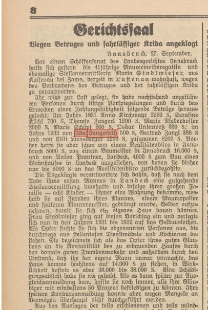 Im September 1934 berichtete der Tiroler Anzeiger über ein Gerichtsverfahren gegen eine Stellvermittlerin, die „Dienstmädels und Köchinnen“ um unterschiedlich hohe Geldbeträge, die sie von diesen borgte, betrogen hatte. Ein Opfer im Jahr 1932 war die Köchin Ida Jungwirth, die um 500 Schillinge (heutiger Wert: 1900,- €) erleichtert wurde, möglicherweise unsere Ida.