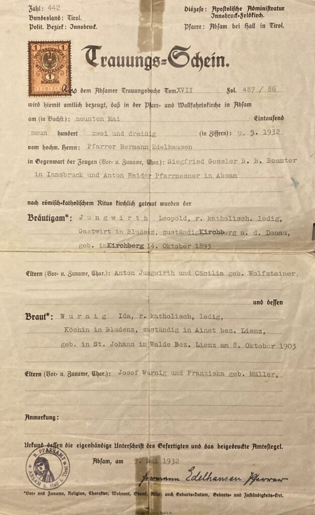 Am 9. Mai 1932 wurden die beiden in der Pfarre Absam (Tirol) ein Ehepaar. Es wird eine Hochzeit im sehr kleinen Kreis gewesen sein, weil als Trauzeugen Herr Gessler, ein Beamter aus Innsbruck, und Herr Haider, Messner in Absam, fungieren mussten.