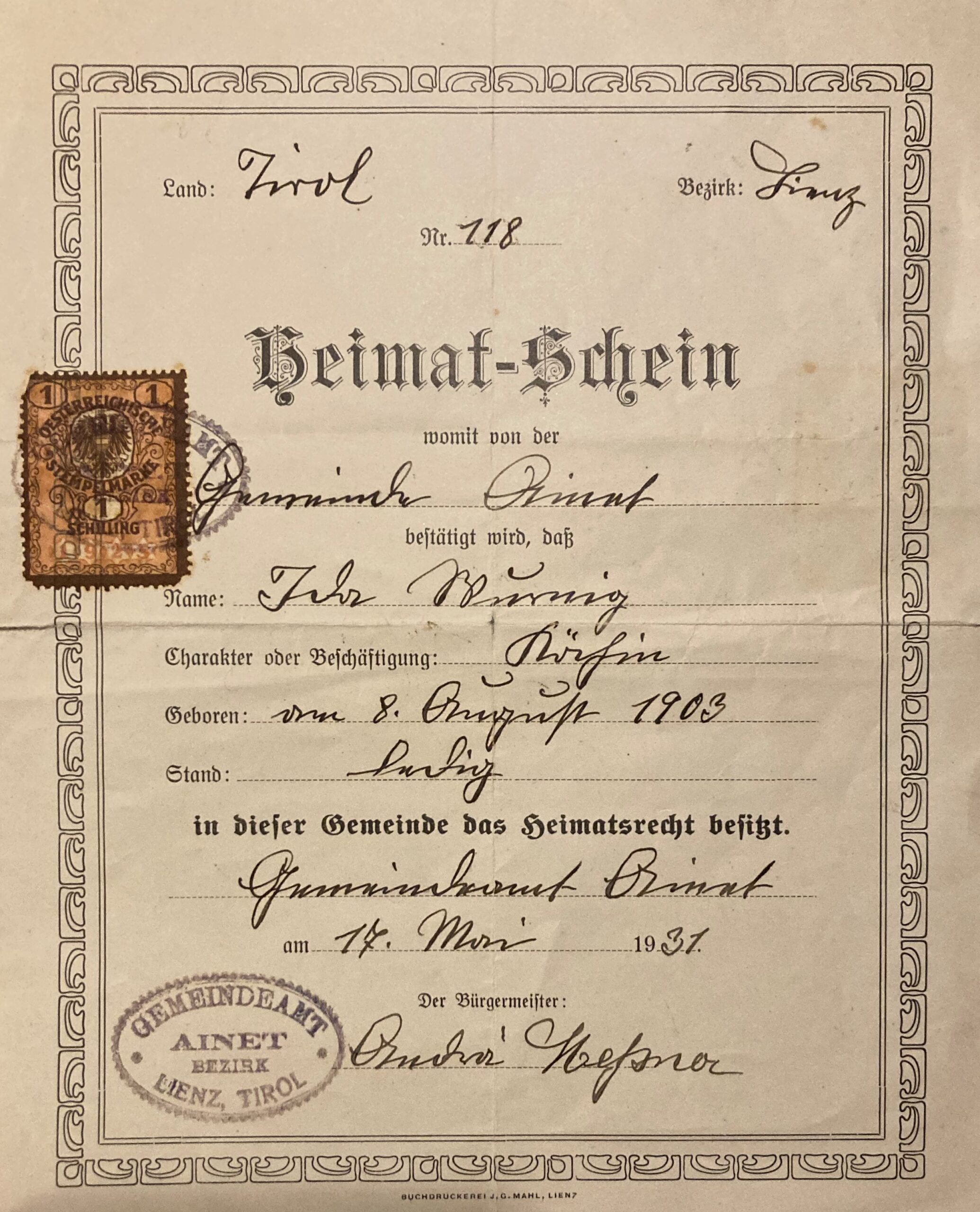 Anscheinend waren sie gemeinsam auf dem Weg zu Idas Heimatort Ainet, um Dokumente zu besorgen. Am 17. Mai 1931 stellte die Gemeinde Ainet in Tirol den Heimatschein aus, als Beschäftigung ist „Köchin“ eingetragen -wohl eine bürokratische Voraussetzung für die geplante Hochzeit.