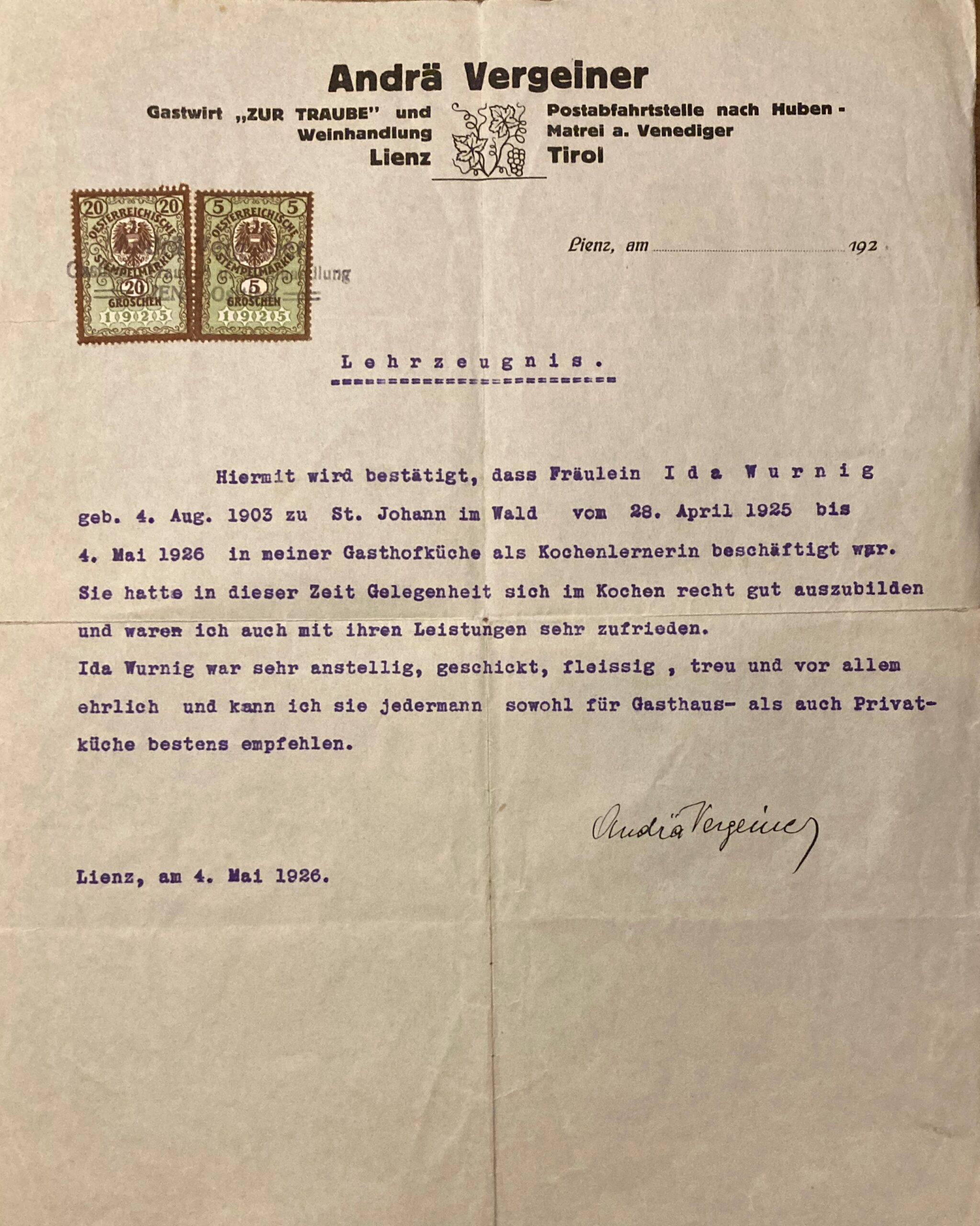 Ida Jungwirth – und damit ein Zeitsprung von 330 Jahren – war anscheinend bis zum 22. Lebensjahr im Elternhaus tätig und lernte dann von April 1925 bis Mai 1926 als „Kochlernerin“ bei Andrä Vergeiner, Gastwirt zur Traube (das heutige Lienzer Hotel Traube). Danach war sie Köchin: bis Juni 1928 im Lienzer Kaffeehaus von Hanns Bergmann (Kaiser Josef Platz) und einige Monate in der Schulküche der neu gegründeten Landwirtschaftlichen Lehranstalt Imst in Tirol.