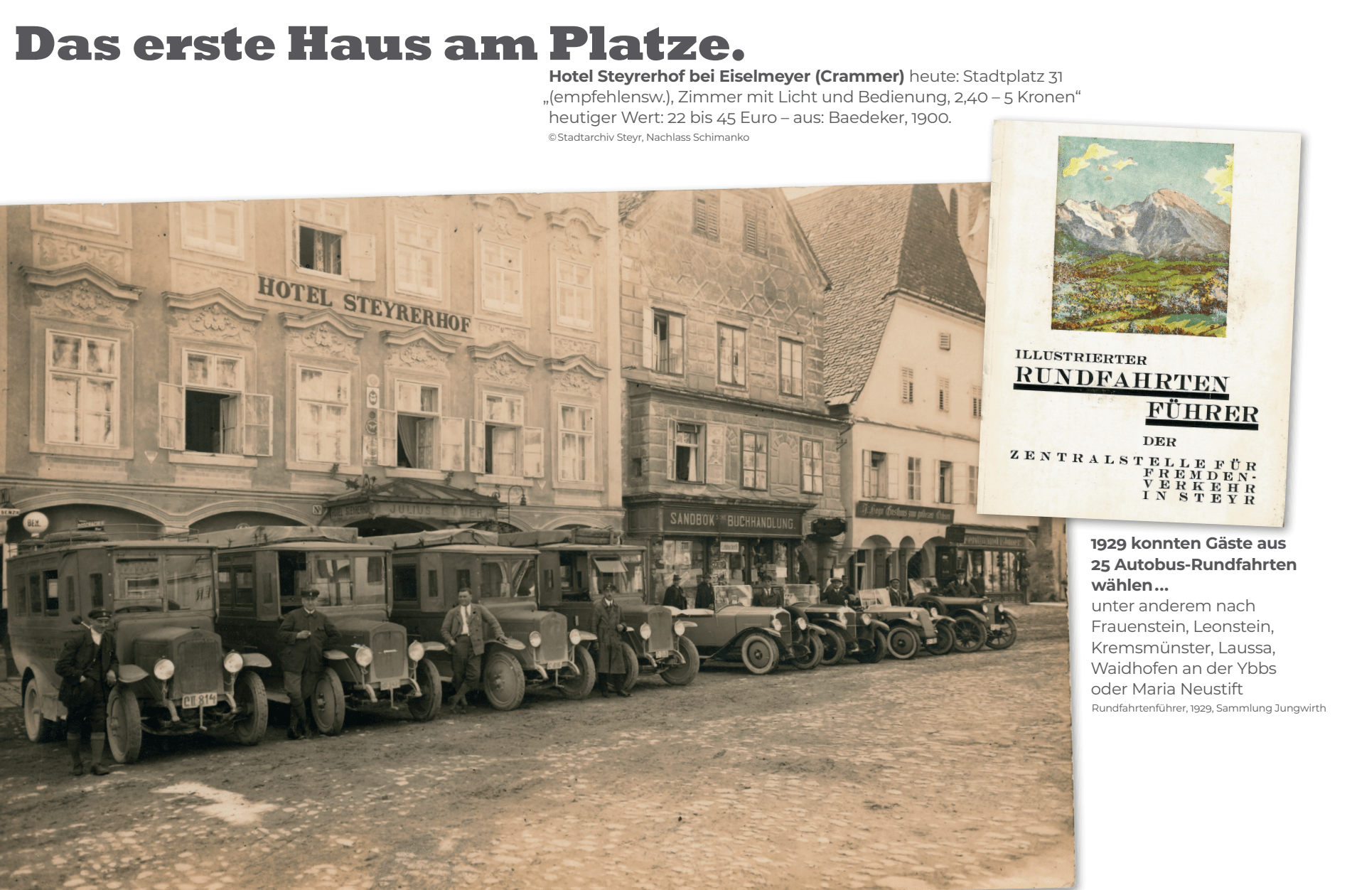 „Das erste Haus am Platze“ – der Steyrerhof um 1900: Zimmer mit Licht und Bedienung für 2,40–5 Kronen – und 1929 schon Ausgangspunkt für 25 verschiedene Busausflüge